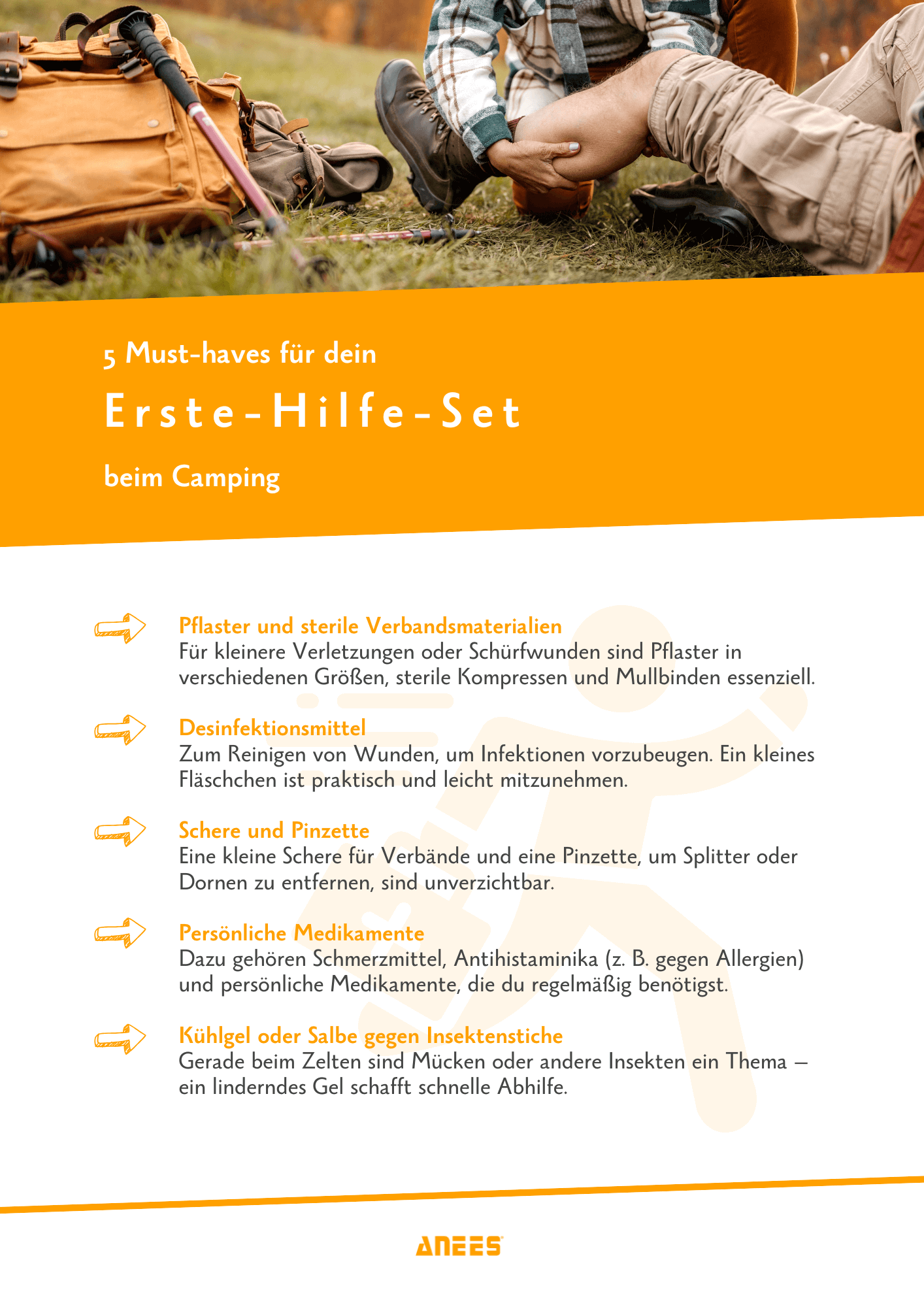 Ein Erste-Hilfe-Set ist ein absolutes Muss. Vom Pflaster über Desinfektionsmittel bis hin zu persönlichen Medikamenten sollte alles dabei sein. Mit diesen wichtigen Gegenständen kannst du kleine Verletzungen oder Notfälle schnell versorgen.