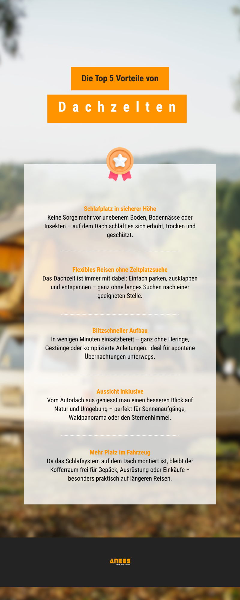 Mit einem ANEES Dachzelt kannst Du Deine Abenteuer uneingeschränkt genießen – flexibel, komfortabel und immer bereit für das nächste Ziel!