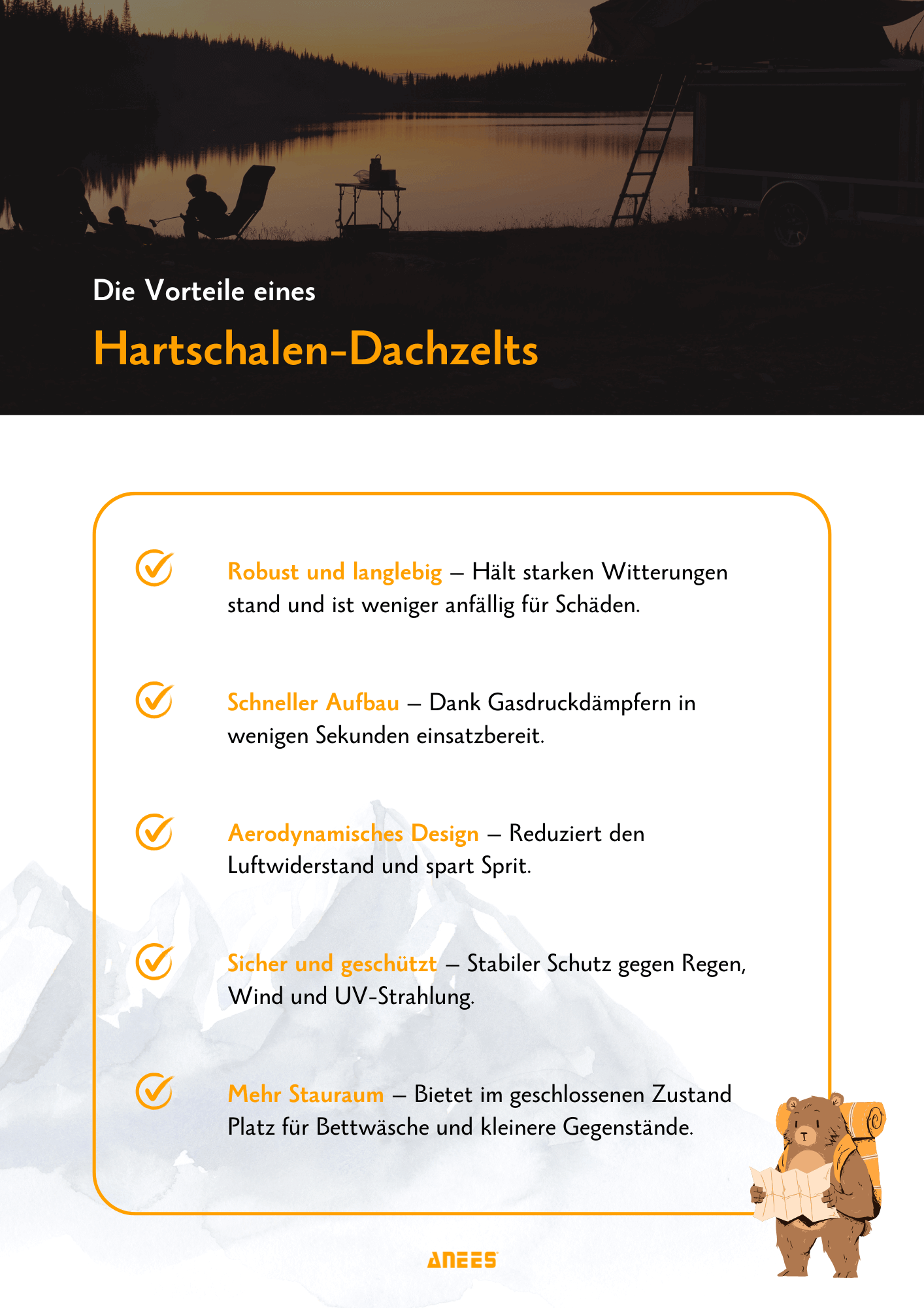 Ein Hartschalen-Dachzelt ist sozusagen die Premiumvariante unter den Autodachzelten. Durch seine stabile Hartschale aus hochwertigem Aluminium, wie sie das ANEES Alu Square Black oder das ANEES Alu Triangle Black in unserem Shop bieten, bietet es optimalen Schutz vor Regen, Wind und Sonne. Besonders vorteilhaft ist das schnelle Öffnen und Schließen – innerhalb von Sekunden kannst Du es mit wenigen Handgriffen aufstellen und Dich direkt in den Schlafsack kuscheln. Die aerodynamische Bauweise reduziert zudem den Luftwiderstand, was sich positiv auf die Spritkosten auswirkt.