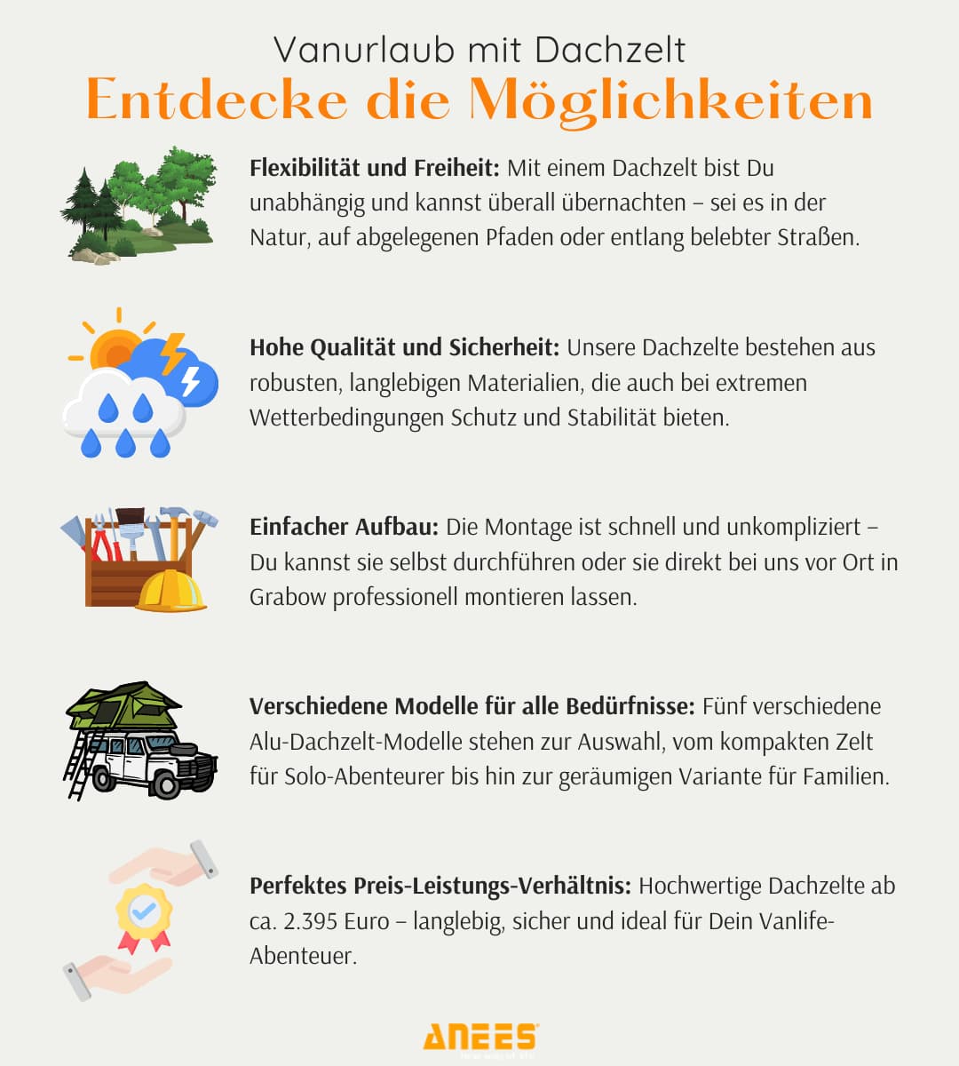 Der Kauf eines hochwertigen Dachzelts in unserem Online-Shop ist die ideale Entscheidung für alle, die Freiheit und Komfort beim Reisen schätzen. Mit einem ANEES Dachzelt verwandelst Du Dein Auto in ein mobiles Zuhause und bist jederzeit bereit für die seit langem geplante Reise oder spontane Abenteuer.
